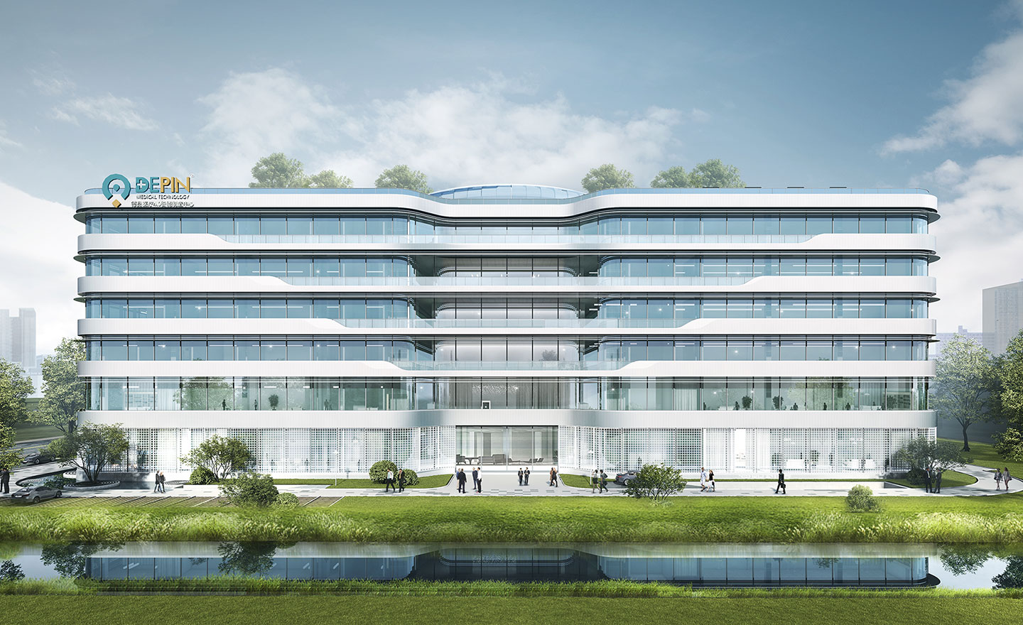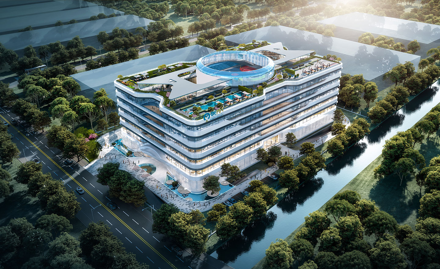 建筑設(shè)計(jì)方面:造型設(shè)計(jì)以天使的光環(huán)——活力核 + 天使之翼為理念。活力核代表著企業(yè)愿景——成為守護(hù)人類(lèi)健康的核心力量,天使之翼寓意著企業(yè)的使命——科技的力量為各地區(qū)的醫(yī)生和患者打造優(yōu)等質(zhì)量和舒適體驗(yàn)的醫(yī)療產(chǎn)品,提升設(shè)備使用效果和價(jià)值,賦能醫(yī)者,助力醫(yī)者共創(chuàng)良好診療效果。加入了屋頂綠化和垂直綠化,每一處綠化都像一個(gè)微型自循環(huán)生態(tài)系統(tǒng),每一層疊加如同創(chuàng)建一座“立體森林”,為使用人員提供愉悅身心的空中花園。