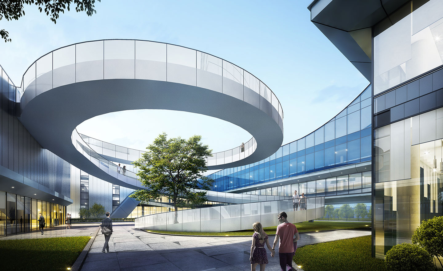 建筑的天際線由若干連續(xù)舒展的弧線構(gòu)成, 隨著人的視線移動(dòng)而不斷變化豐富的天際線效果。 而連綿起伏的屋頂曲線正是江南傳統(tǒng)聚落最具代表性的特征。 江南建筑中“如鳥(niǎo)斯革, 如翠斯飛”的飛檐反宇在此以現(xiàn)代的簡(jiǎn)潔手法隱喻,故而現(xiàn)代簡(jiǎn)練的建筑風(fēng)格與江南傳統(tǒng)文脈的印象完美融合。