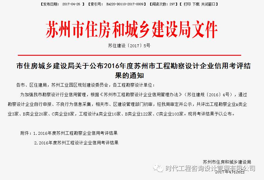 公司2016年度蘇州市工程勘察設(shè)計(jì)企業(yè)考評(píng)為工程設(shè)計(jì)A類企業(yè)