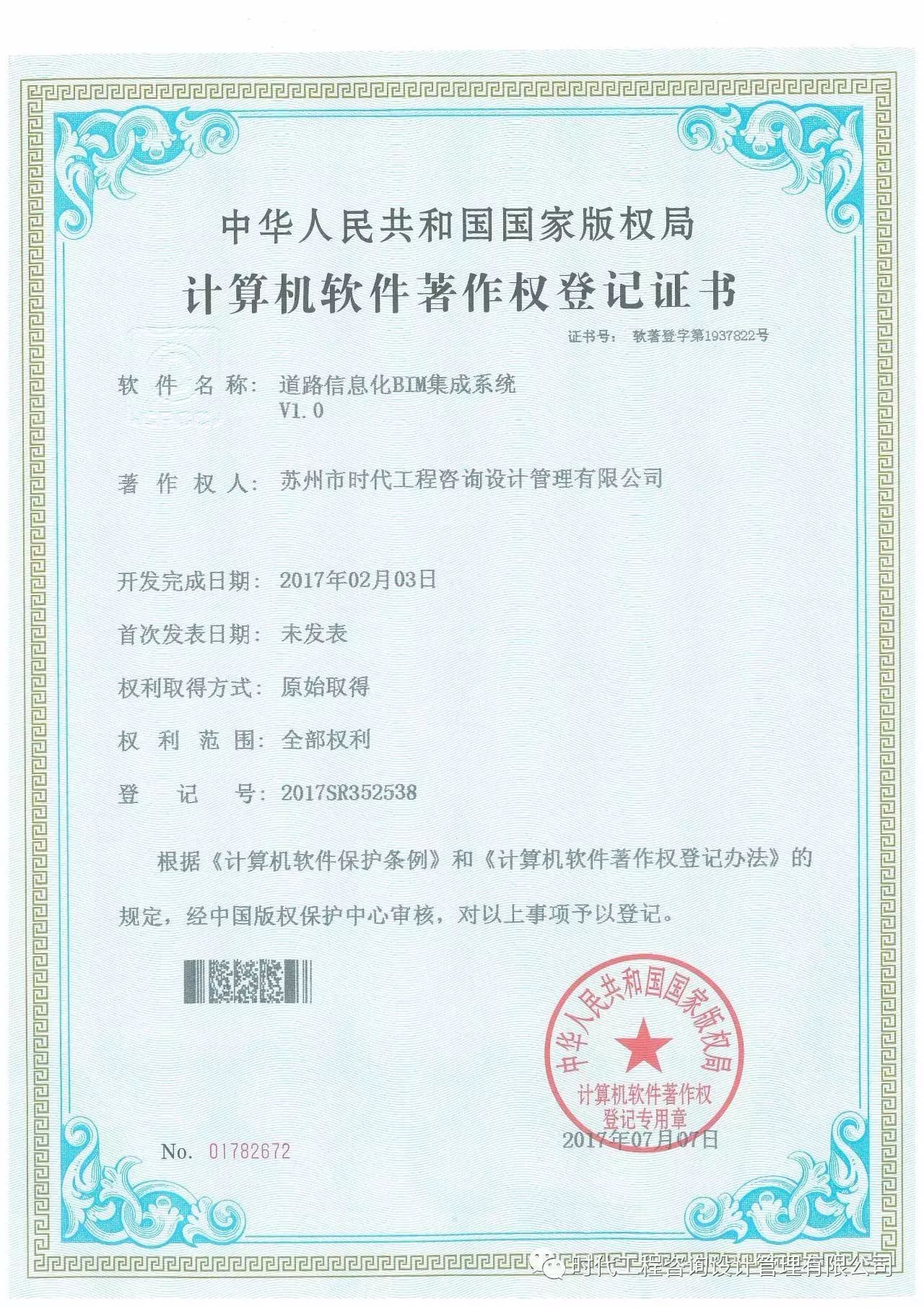 時代BIM通過對多個市政項目BIM應用進行歸納總結,費時1個多月,自行研發了《道路信息化BIM集成系統》。并于近日順利獲得國家版權保護中心頒發的軟件著作權證書。