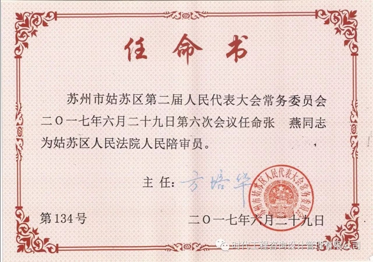 2017年上半年,我公司員工張燕同志經過組織推薦,法院面試、座談、考察和政審,在公示征詢社會各界意見后,由蘇州市姑蘇區第二屆人民代表大會常務委員會第六次會議正式任命為姑蘇區人民法院人民陪審員。