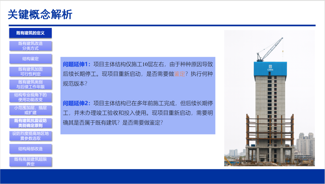 (2)關鍵概念解析:包括既有建筑的定義,既有建筑改造方式分類,結構鑒定,既有建筑加固可行性判定,既有建筑類別與后續工作年限,結構專業視角下的使用功能改變,小范圍加層、插層或擴建,如何確定既有建筑抗震設防類別,設防烈度提高地區地震參數選取,結構局部改造,既有高層建筑超限鑒定等